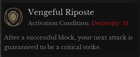 Vengeful Riposte: At 33 Dexterity, fighters' next attack will always be a critical strike after successfully parrying or blocking an attack.
