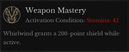 Weapon Mastery: At 42 Stamina, Whirlwind gain a shield when activate.